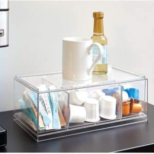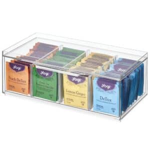 Organize your kitchen in style with the iDesign Crisp Stackable Tea Packet Storage Organizer Drawer with Lid. This three compartment organizer is great for storing tea bags, sugar packets, sweeteners, and more. This container is perfect for use on the countertop next to the tea kettle or on cabinet and pantry shelves. The removeable dividers allow for customizable storage. The hinged lid allows for convenient access when used on its own, while the slide-out front drawer provides easy access when multiple bins (sold separately) are stacked together. Made with durable BPA-free clear plastic, this organizer is designed for every day use and is easy to clean with mild soap and warm water. Measuring 12.59″ x 6.23″ x 4.57″, this tea bag organizer is perfect for compact spaces on the kitchen counter. With iDesign by InterDesign, you can #LiveSimply every day.