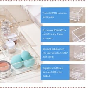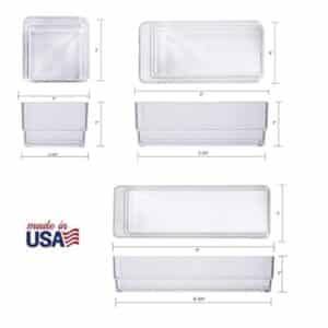 Time to get your drawers organized! With many applications and configurations, these individual organizers can fit side by side to divide and contain all of your desk clutter. Perfect to keep cosmetics organized in your vanity and bathroom drawers! Also great for craft, office, and kitchen drawers. Each of the containers can stack on top of each other allowing for easy access to items below. Great for deep drawers! Purchase additional sizes to customize your organizational needs. Create modular sets to fit a multitude of items. Clear break-resistant plastic fits in any decor. Accessories shown are not included. No assembly required. Cleans easily with mild soap and warm water. Made in USA.